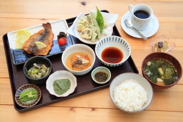清流の森ならではの人気定食。季節の野菜や山菜を楽しめる小鉢と、野菜天婦羅、イワナのソテー、ご飯、みそ汁に加えて、食後の珈琲・デザート付きのお得な一品です。