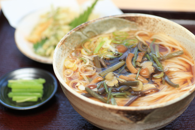 日本三大うどんの稲庭うどんに山菜を組み合わせた一品。乾麺とは思えないツルツルとした喉越しが特徴のうどんです。他に季節の山菜と、野菜の天婦羅が付いたとてもお得なセット。